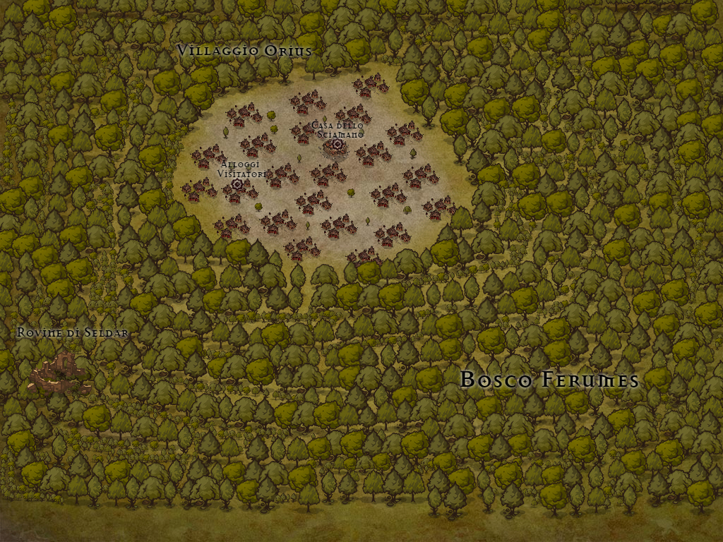 Villaggio Orius All'ineterno del bosco notate delle case in legno con tetti in paglia, notate molti elfi mezz'elfi e qualche umano all'interno della comunità, ci sono molti armati di lance e armature in pelle che fanno da guardia al villaggio.